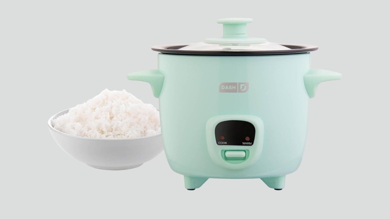 The Dash Mini Rice CookerPerfect for an individual or a pair that typically prepares small amounts of rice. It includes a detachable, half-quart non-stick pot capable of holding one full cup of raw rice and one and a quarter cups of water; after approximately thirty minutes, you’ll end up with about two cups of cooked rice.