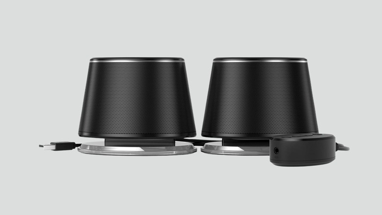 This set of two Amazon Basics Bluetooth speakers can easily fit below a monitor or beside a laptop, only requires a USB connection to function, and looks fairly sleek, with subtle built-in blue lights to complement the speaker’s all-black body. There’s an included remote that lets you control the volume and source and features a built-in auxiliary input.