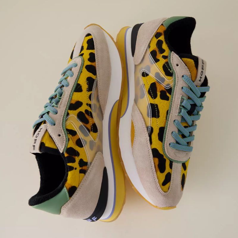 Featuring a striking, mustard leopard pattern, these sneakers offer a highly noticeable appearance, with blue laces and green highlights adding even more vibrant details. However, this pair of shoes isn’t just about looks; they also deliver on performance, thanks to a leather upper that ensures longevity, along with memory foam insoles for added comfort.