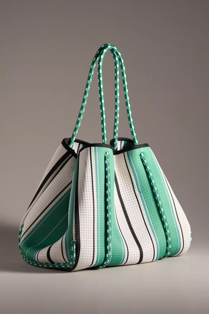 This strong neoprene bag is ideal for daily use. It includes a hook-and-loop closure, one inner zip-top pocket, and can be washed in a machine. Trendy, practical, and priced under $42 on sale.