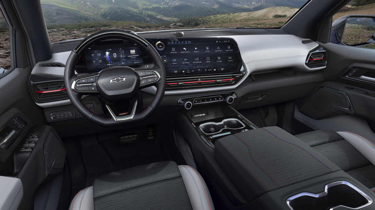 - Off-Road Hardware: A 2-inch lift, 35-inch all-terrain tires, special suspension tuning, skid plates, and Terrain drive modes are all present here. Chevy also adds Sidewinder diagonal steering, meaning all four wheels turn in the same direction, and four-wheel steering for maneuverability on trails or in tight parking lots.