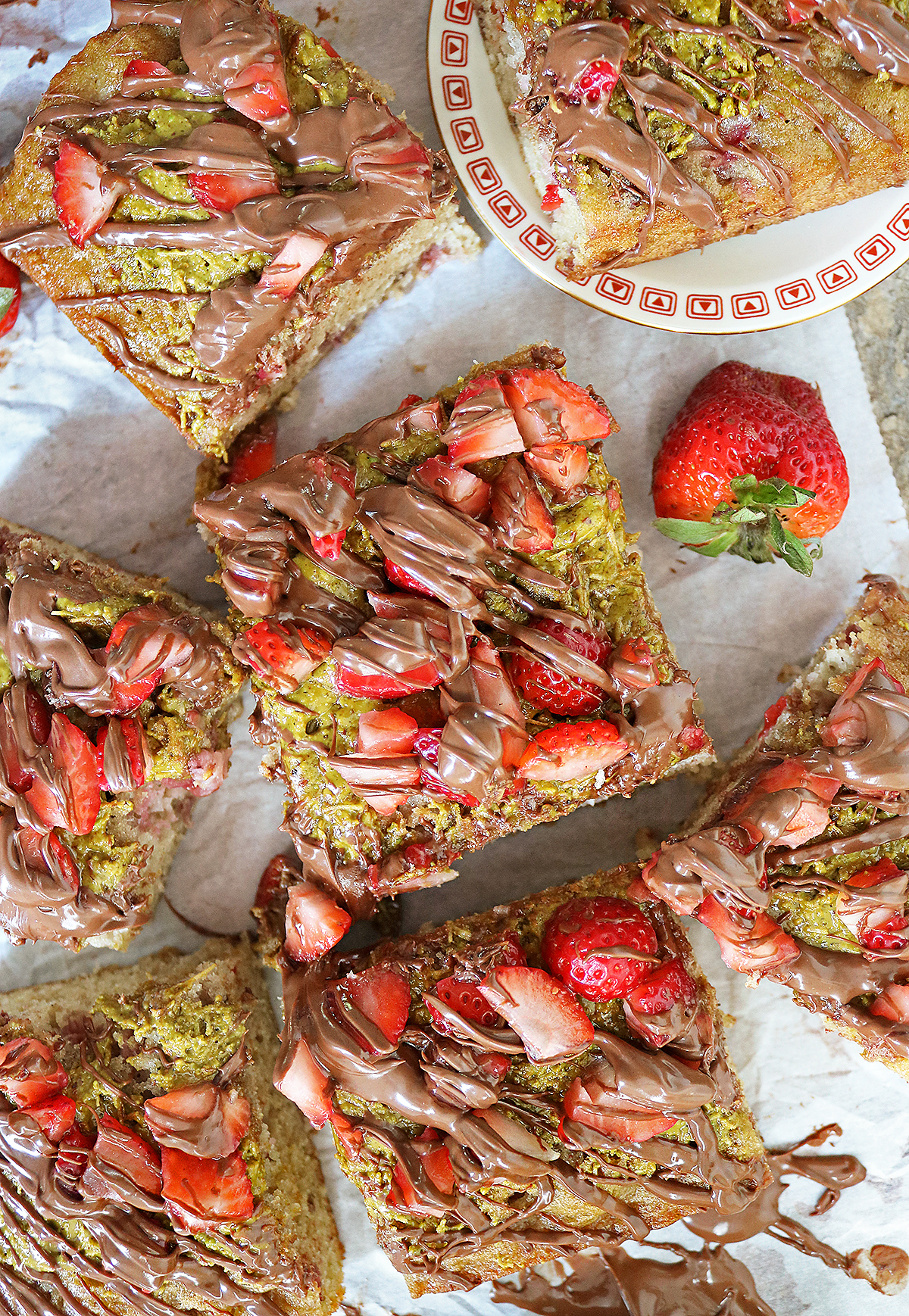 This cake has layers of a moist strawberry cake topped with a pistachio kataifi pastry mixture, fresh strawberries, and melted chocolate.