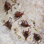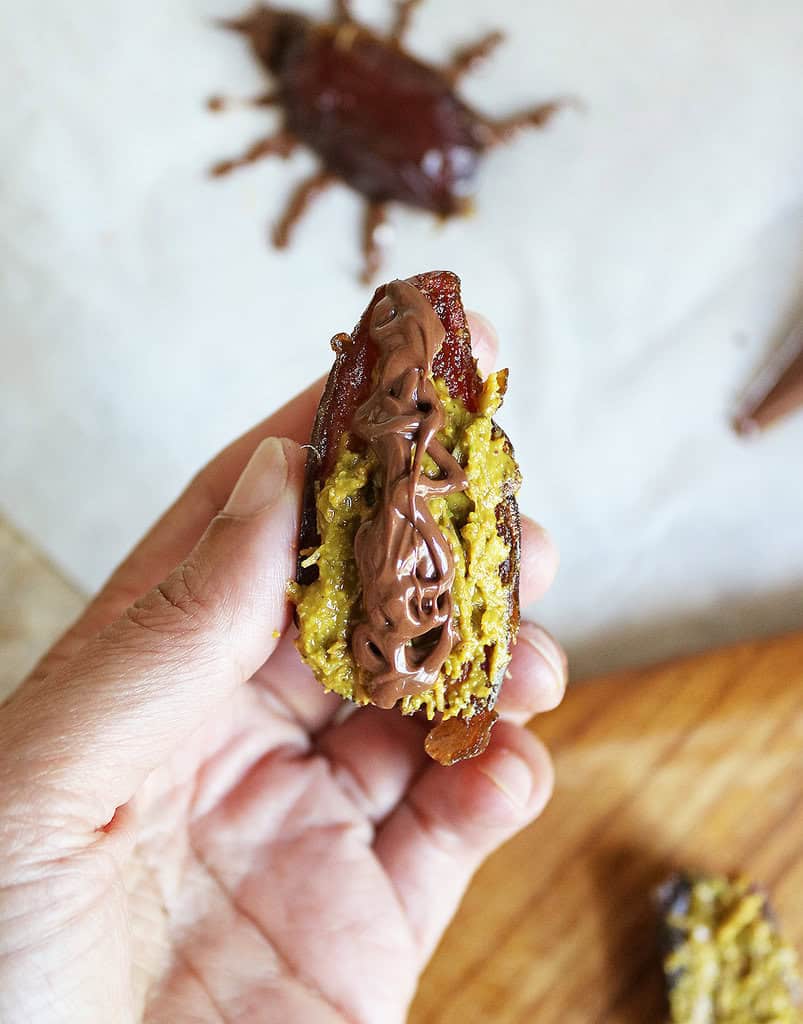 - Carefully squeeze some melted chocolate on the back of the body of the stuffed cockroach. Then, place the date, chocolate-side down, on a piece of parchment paper set on a board or flat plate.