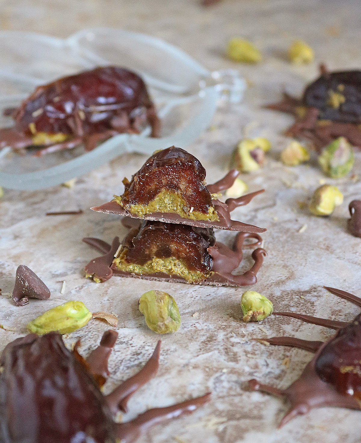 - Pipe a chocolate head, antennae, and legs. Repeat this on the other pistachio kataifi-stuffed dates.