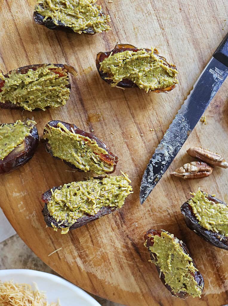 - Cut the dates in half and spoon a little bit of the pistachio kataifi mix into the date cavity. Repeat with all the date halves.