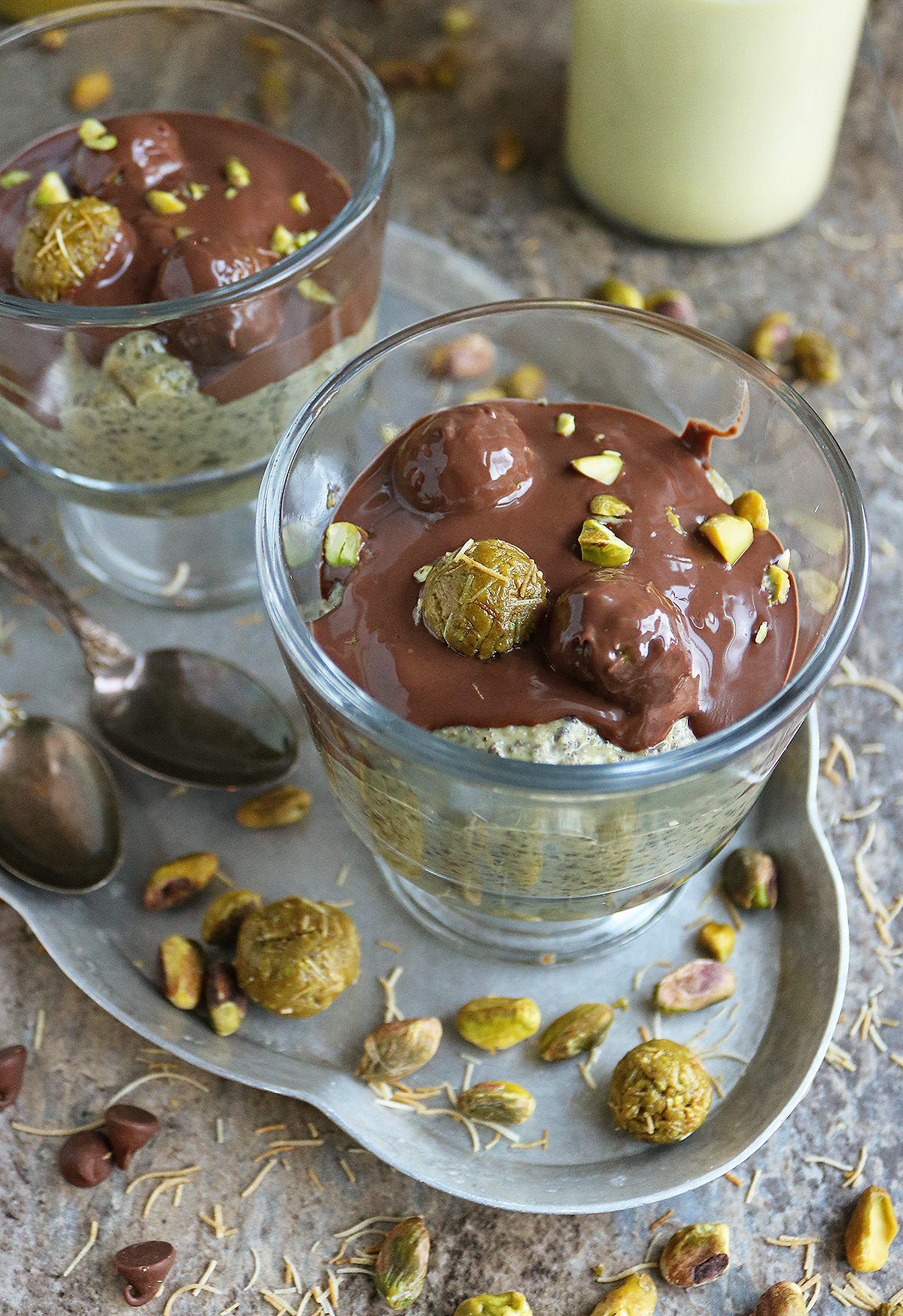 Chia pudding gets a Dubai chocolate twist in this recipe. It features pistachio kataifi chia seed pudding topped with pistachio kataifi bites and chocolate.