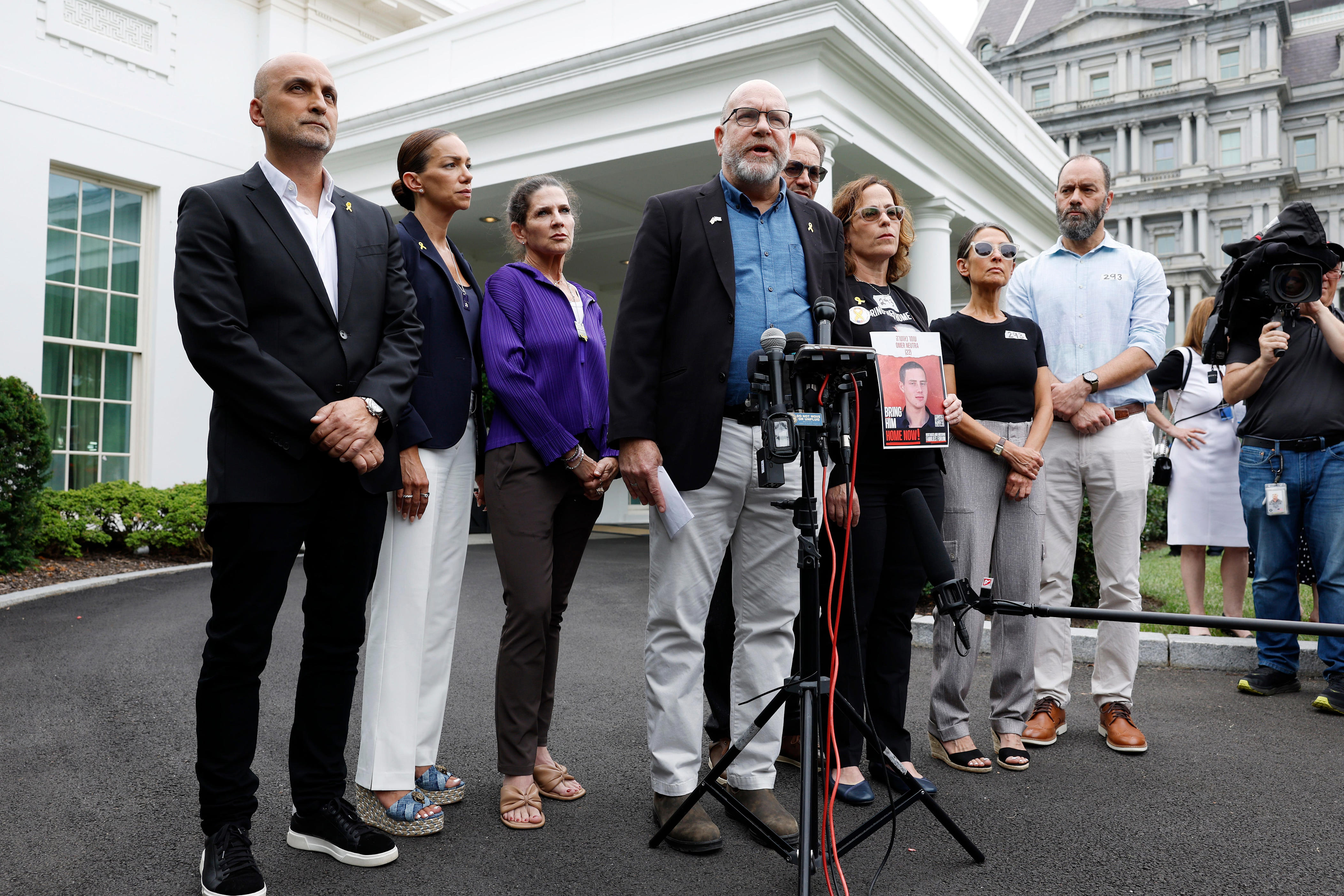 The cantor stands to lead the congregation in prayer, which will be followed by a ritualistic chanting of Acheinu. Jews have been reciting this prayer for almost a thousand years, but for many, this is the first time they are saying it in the presence of Goldberg-Polin and her husband.