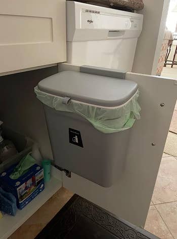 Promising reviewSo I came across a small trash bin on TikTok, and since I was moving into a compact studio apartment, I thought it would be ideal.It seems it’s one of the best purchases I’ve ever made.I mounted mine using the cabinet hooks (which also includes adhesive stickers) on my kitchen island, and it’s incredibly convenient—words can’t describe how much I love it.The lid is equipped with a convenient hinge, allowing you to open it by lifting the lid up or by sliding it forward, where it then folds down and out of the way.I typically leave it open while I’m preparing food, but I can shut it down very fast if I notice the dog approaching.There’s a small tab for convenient opening. It’s very simple to use and easy to clean. It’s also really adorable!I utilize my plastic grocery bags as trash can liners, and they fit perfectly. It includes a roll of bags as well. The lid opens easily to replace the bags. It clicks back on smoothly over the new liner. I highly recommend this product!!This is making its way to my list of ‘greatest purchases I’ve ever made.’” —Ginger