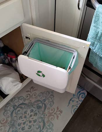 26. A small compost bin/trash canIt will easily hang on a cabinet door for convenient storage and access. The lid can be lifted or flipped open for simple disposal while you prepare food. Living alone means you probably generate much less waste and won’t need a large kitchen trash can to hold the mess!
