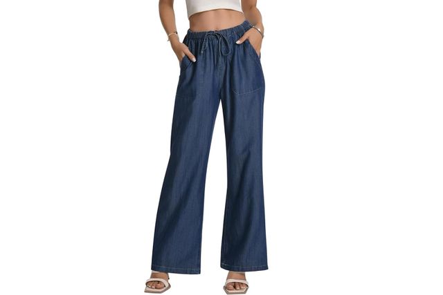 This outfit is put-together enough that I can wear it to my office, which tends to lean more casual, although I would wear it out to dinner, too. I love the thick contrasting stripes of this oversized button-down shirt, and I’d pair it with flowy, dark-wash jeans that give the outfit a relaxed feel. Shoppers love the Potili Drawstring Jeans, which deliver on both comfort and style. When the weather cools down, you can layer a V-neck sweater over the button-down.
