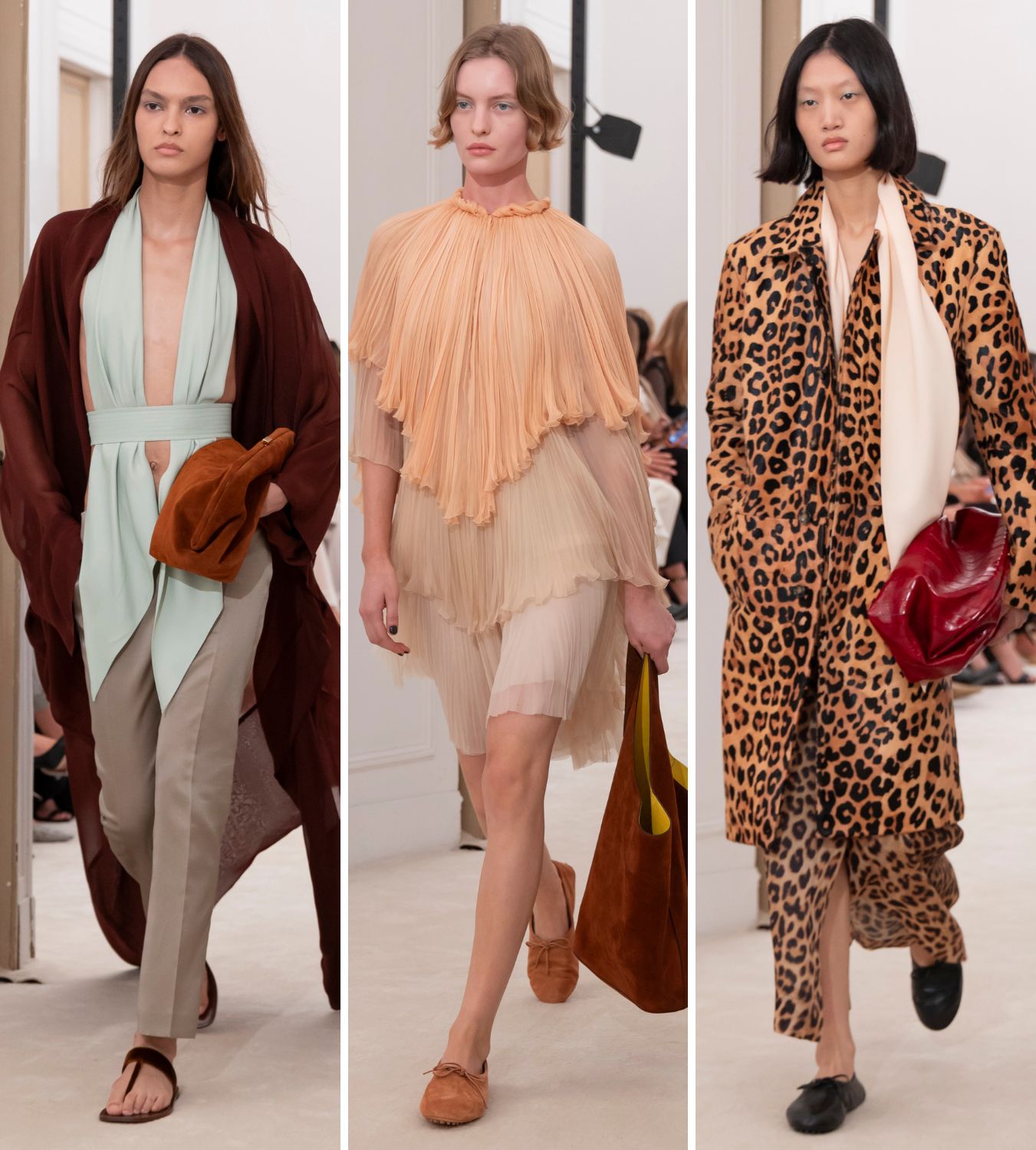 The final collection? Subtly stunning, gracefully flowing, clothing centered around neutral tones that stylish, affluent women would genuinely desire to wear. Draped and pleated dresses evoked the imagery of classical Greek sculptures, and the tailoring was similarly soft and airy, while a touch of excitement was introduced through leopard patterns, metallic hues, blood-red and cobalt-blue handbags, as well as occasional, subtly alluring glimpses of skin.