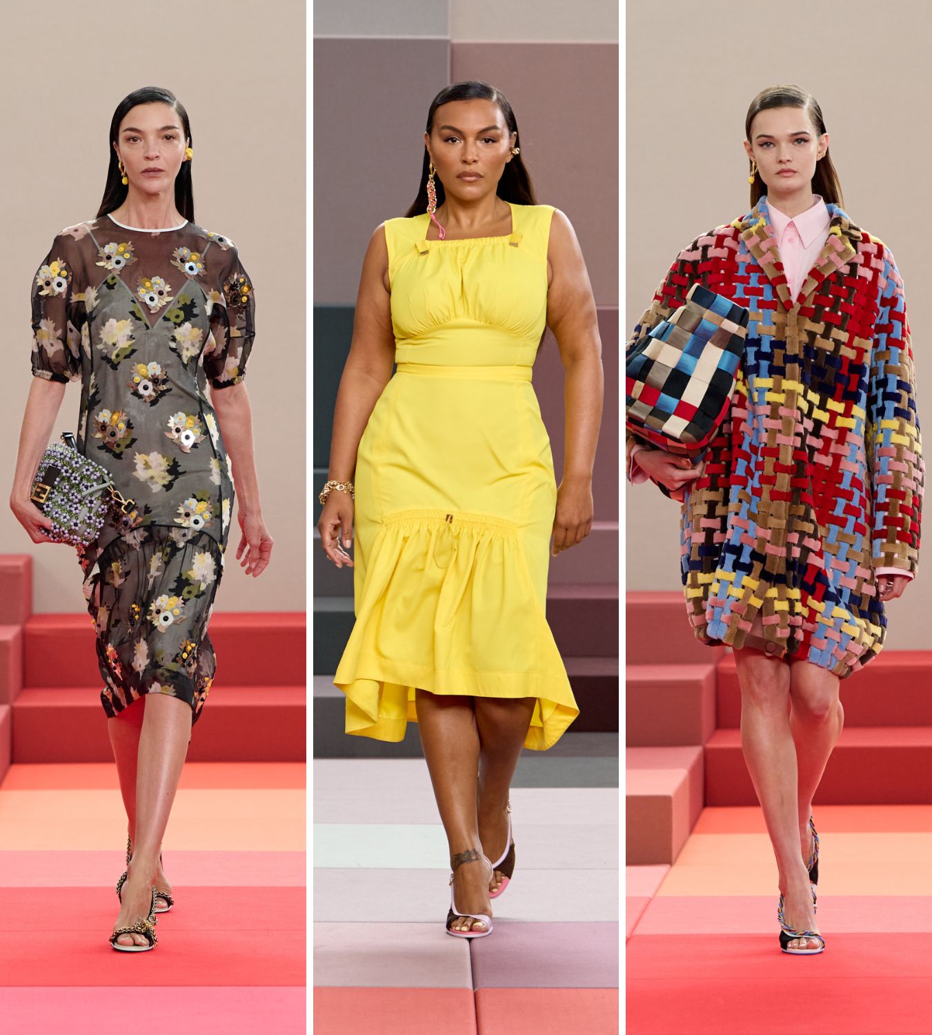 Fendi’s SS26 presentation centered around color, from the pixelated stage designed by Marc Newson to the outfits that walked the runway. The color scheme was bold, diverse, and occasionally unexpected (think pink and red, anyone?), and it brought endless joy—just like the casting, which featured models Paloma Elsesser, Natasha Poly, Alex Consani, Gabbriette, Adwoa Aboah, Mariacarla Boscono, and Karen Elson. Flowers were also present throughout, but in ways that felt wonderfully new: printed on shimmering layers, cut from leather pieces, forming the lace for skirts and dresses, embroidered on bags, dangling from them as charms, and even integrated into furs. As the show notes perfectly put it, this is a vision of “a future summer, seen through a fantastical Fendi lens.”