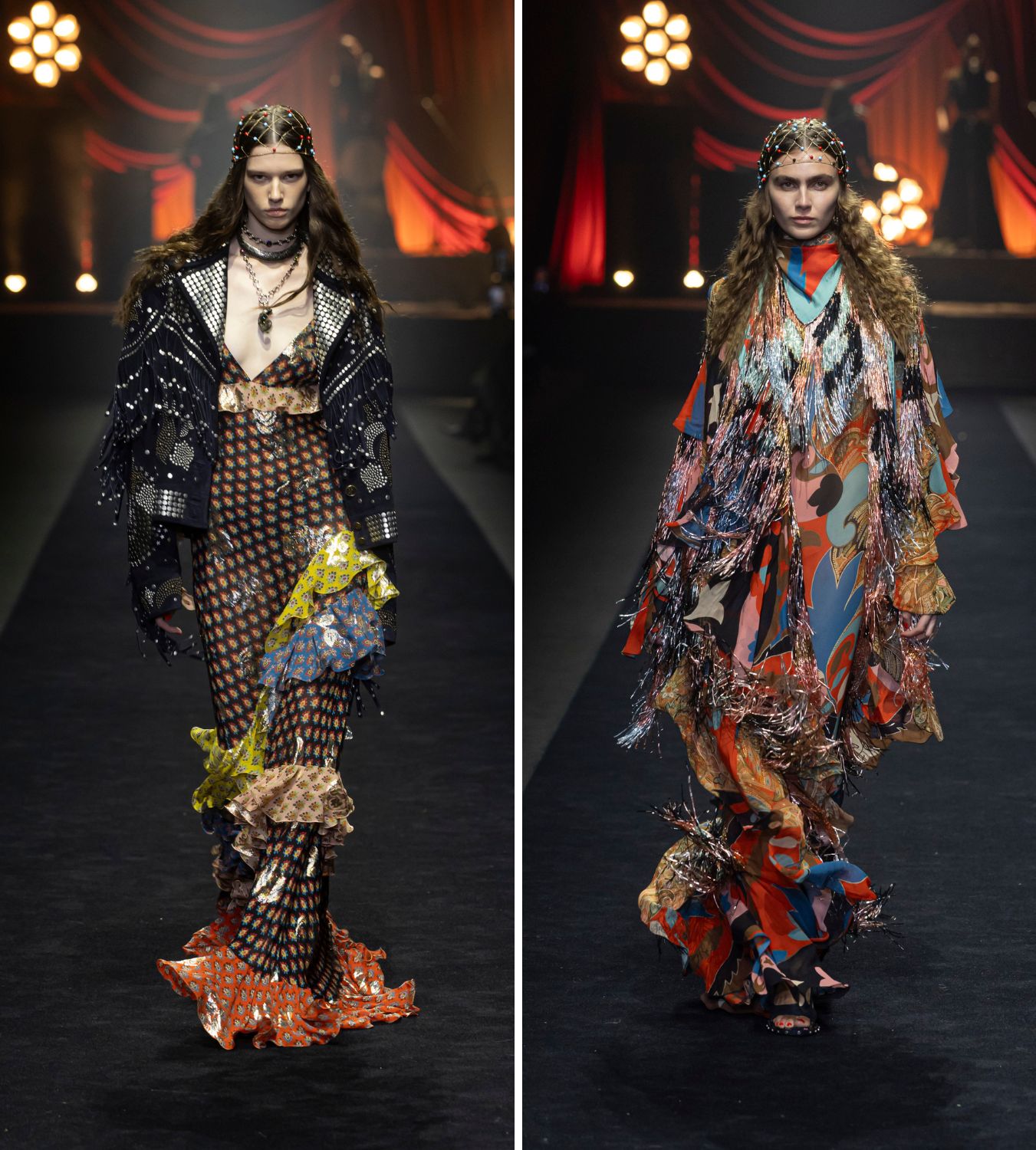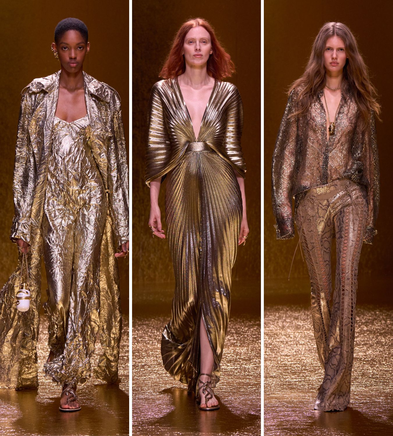 Fausto Puglisi’s newest collection for Roberto Cavalli was truly overflowing with gold—and we wouldn’t expect anything less from a brand that is so deeply committed to dazzling glamour. The popular metallic finish appeared on everything from denim and velvet devoré pants to lamé gowns, swimwear, and sunglasses, along with a generous amount of Cavalli’s iconic snake pattern. As the show notes beautifully stated: “Selecting gold isn’t just about choosing a color, but adopting an aesthetic vision: luxurious, daring, and modern, much like the women who have always worn Cavalli.” And it’s certain that they will fall in love with each amazingly shiny, golden piece.
