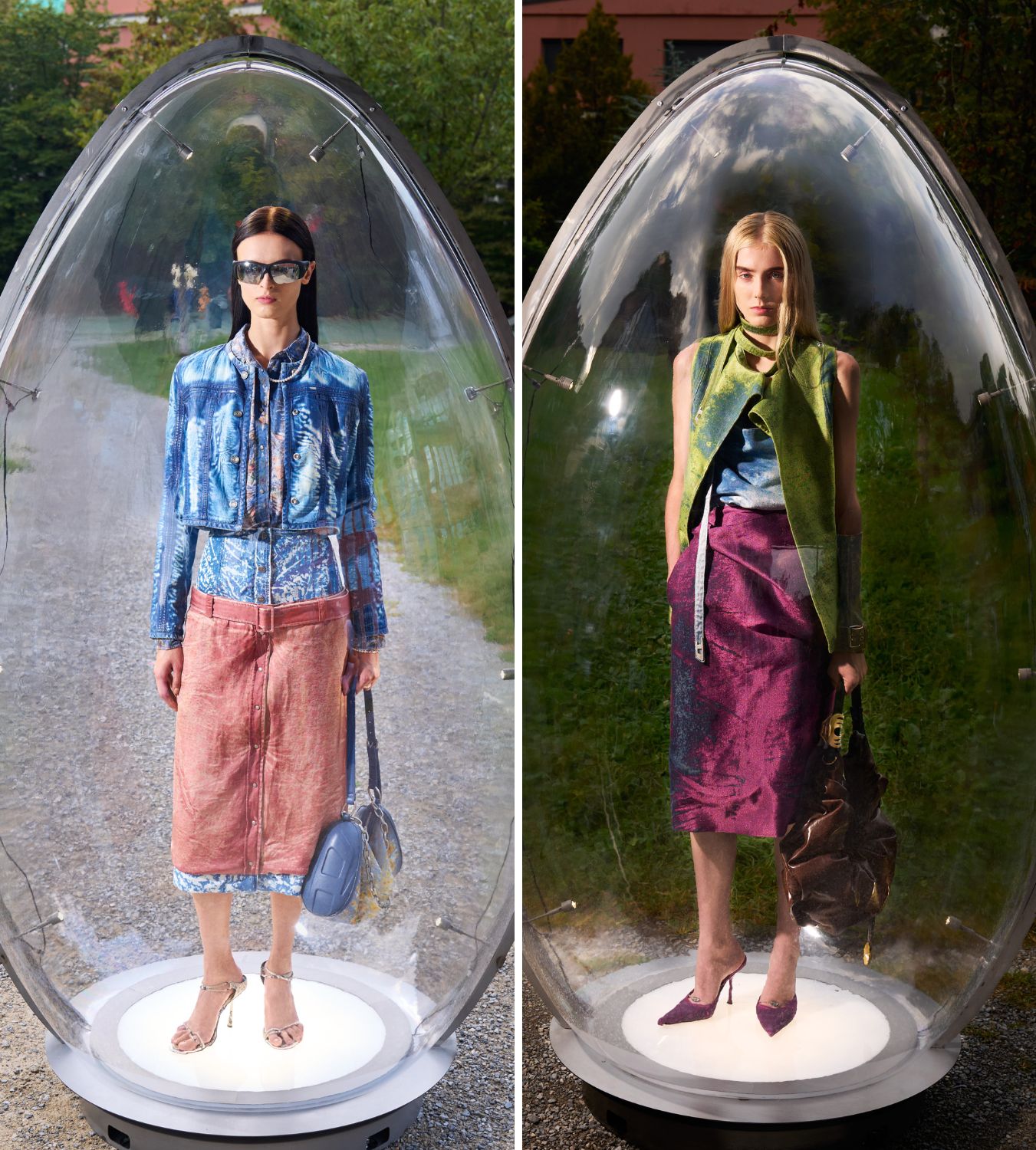 Diesel began Milan Fashion Week with a unique pop-up display located in the center of the city, featuring models positioned inside transparent egg-like structures. This approach offered a more personal way to showcase their latest collection, as opposed to a typical fashion show, allowing guests to view each outfit up close. Consider: vibrant lime green and purple jeans, fabrics resembling spray paint with a cracked texture, and small floral patterns paired with structured jackets, pencil skirts, and sophisticated accessories. The general public was also encouraged to join in, participating in an interactive ‘egg hunt’ throughout the city to engage with the collection firsthand.