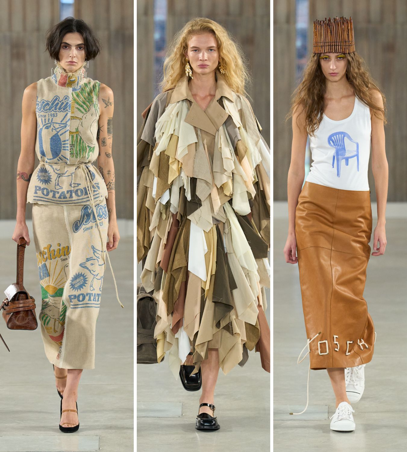 You can always count on Moschino to add a touch of playful humor to Fashion Week, breaking the serious mood. However, Adrian Appiolaza’s SS26 collection offered plenty of fun and whimsical elements—such as knitted swan-shaped nipple covers, experimental headwear, oversized smiley face motifs, trompe l’oeil patterns, and stockpot bags, among others—but it also seemed somewhat more subdued and accessible than usual. In fact, the collection was titled ‘Niente’ (Italian for ‘nothing’) and drew inspiration from theArte Poveramovement, thus the “return to simplicity” and core principle of “reuse, recycle, reimagine.” Archival prints were reimagined in new ways, capes crafted from fabric remnants, potato sacks turned into formal attire, and ordinary items from daily life elevated into high-fashion patterns and accessories.