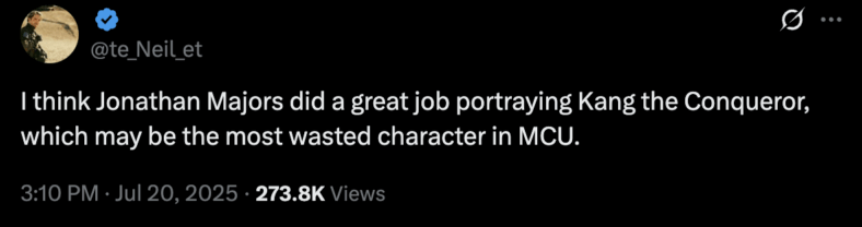 “I believe Jonathan Majors did an excellent job playing Kang the Conqueror, who might be the most underused character in the MCU,” X user@te_Neil_ettriggered a series of negative responses to the announcement shared on the website byThe Hollywood Handle.