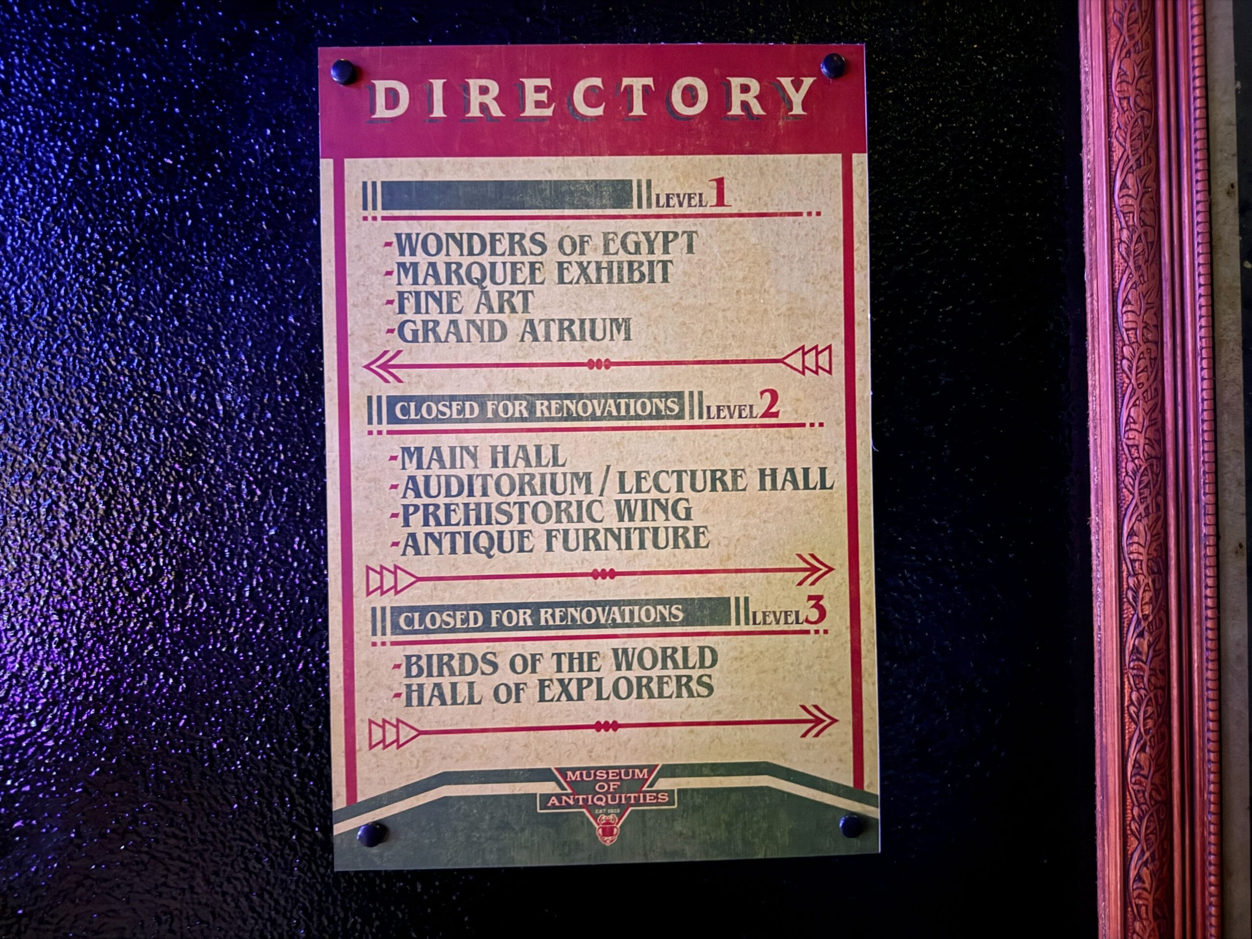 A directory for the Museum of Antiquities is located beside the posters. It states that levels 2 and 3 are closed due to ongoing renovations. Level 1 contains the Wonders of Egypt, Marquee Exhibit, Fine Art, and the Grand Atrium.