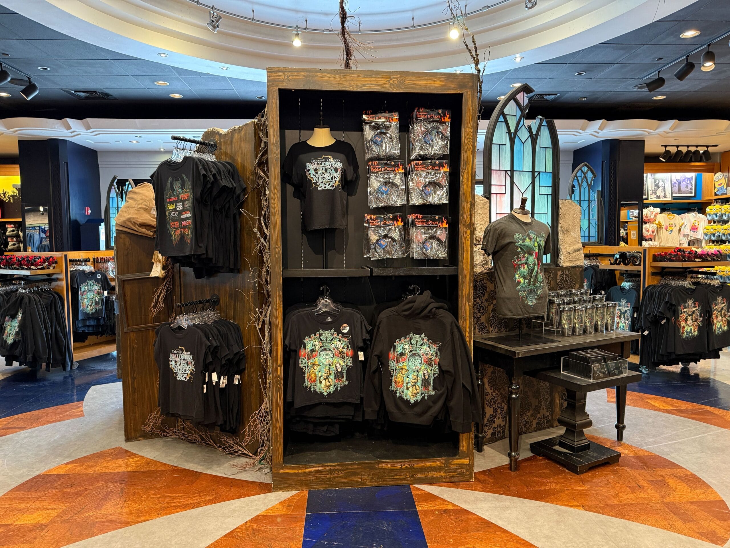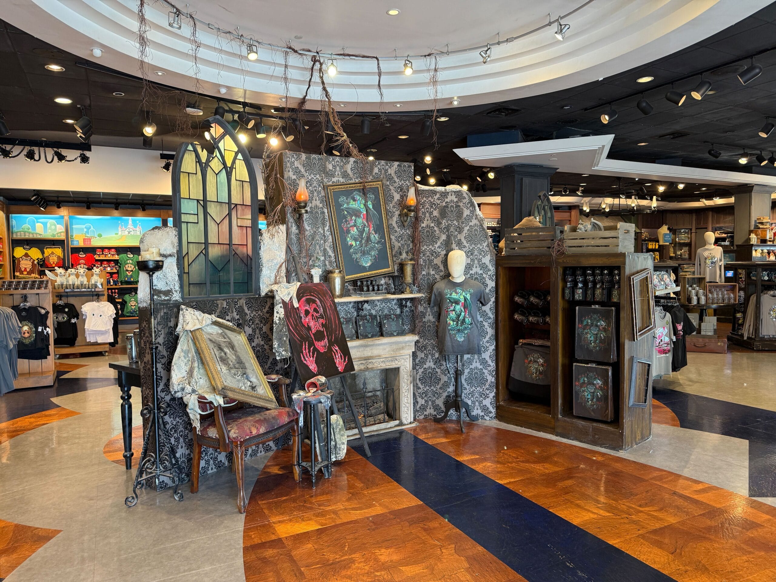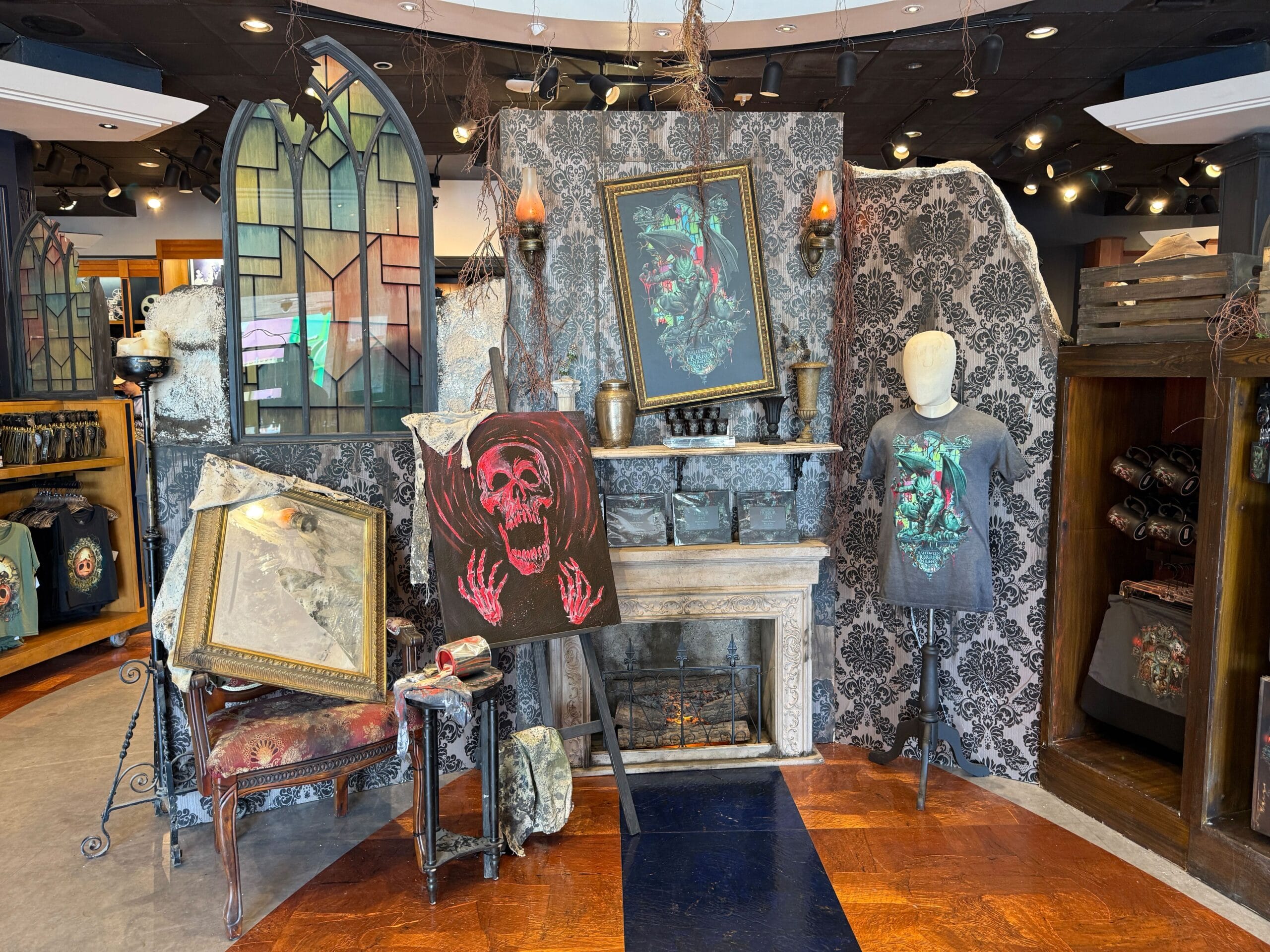 A new haunted display for HHN products is now available at the Universal Studios Store located in Universal Studios Florida. It features damask wallpaper and old, worn-out furniture. The setup also includes shattered green stained glass windows and additional shelves.