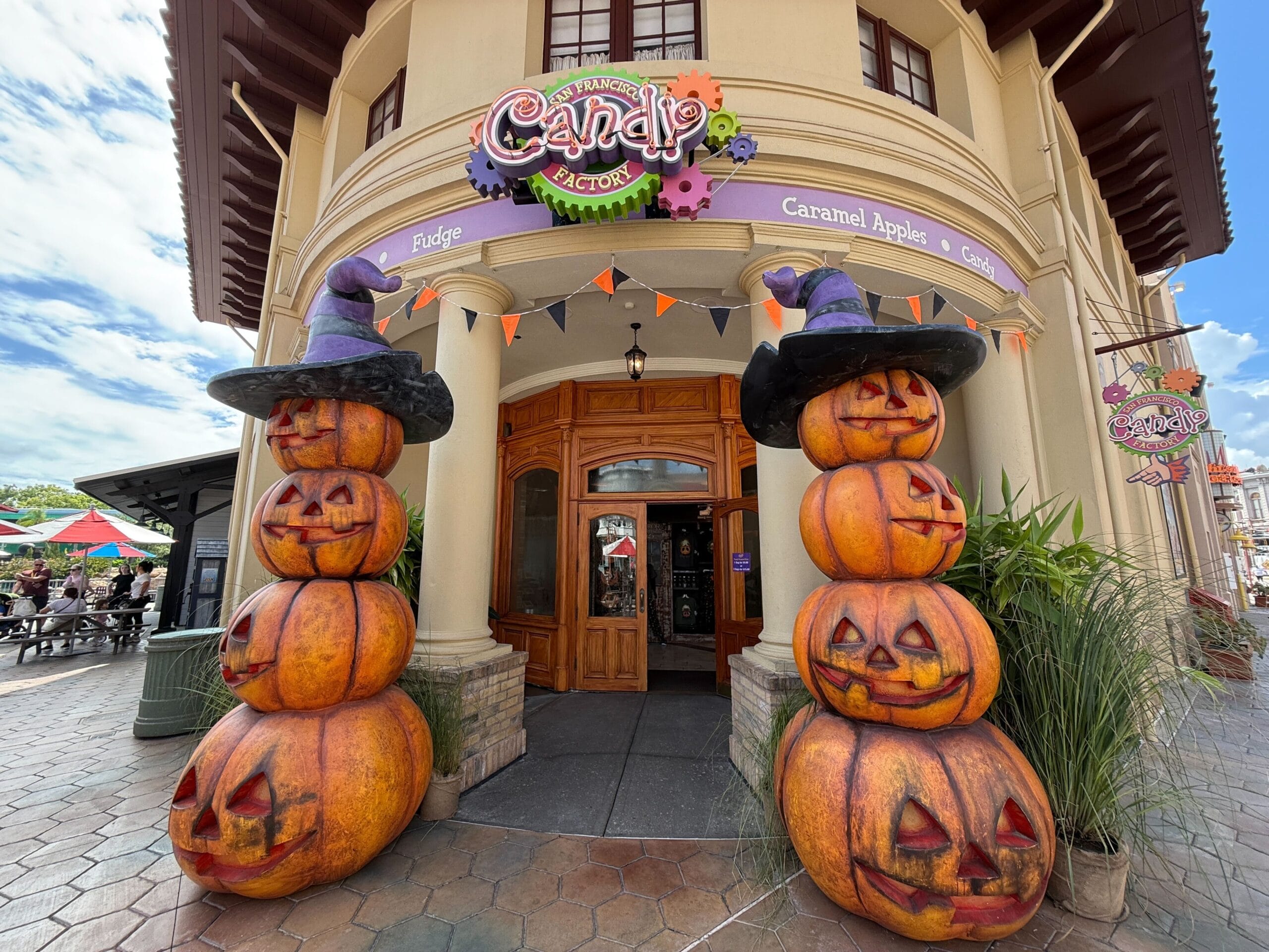 Near the San Francisco Candy Factory, there are piles of jack-o’-lanterns adorned with witch hats from the2022 Vengeful Retribution haunted area. They’ve returned to HHN in different themed areasover the years — and collected a significant amount of dirt. Black and orange streamers line the entrance of the candy store.