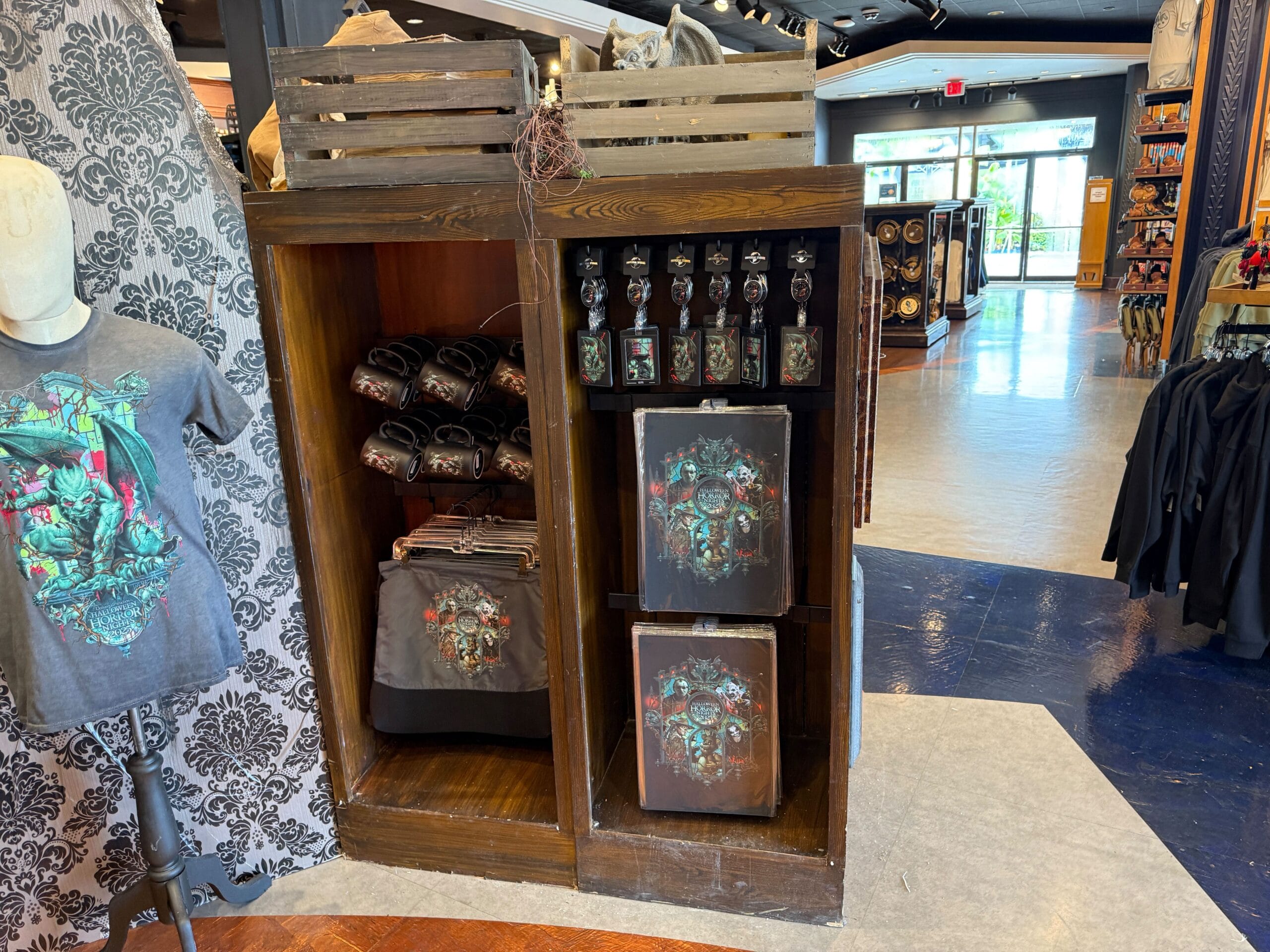 A stone gargoyle figure is inside a box placed on top of some shelves. HHN products that include gargoyles are showcased in this area.