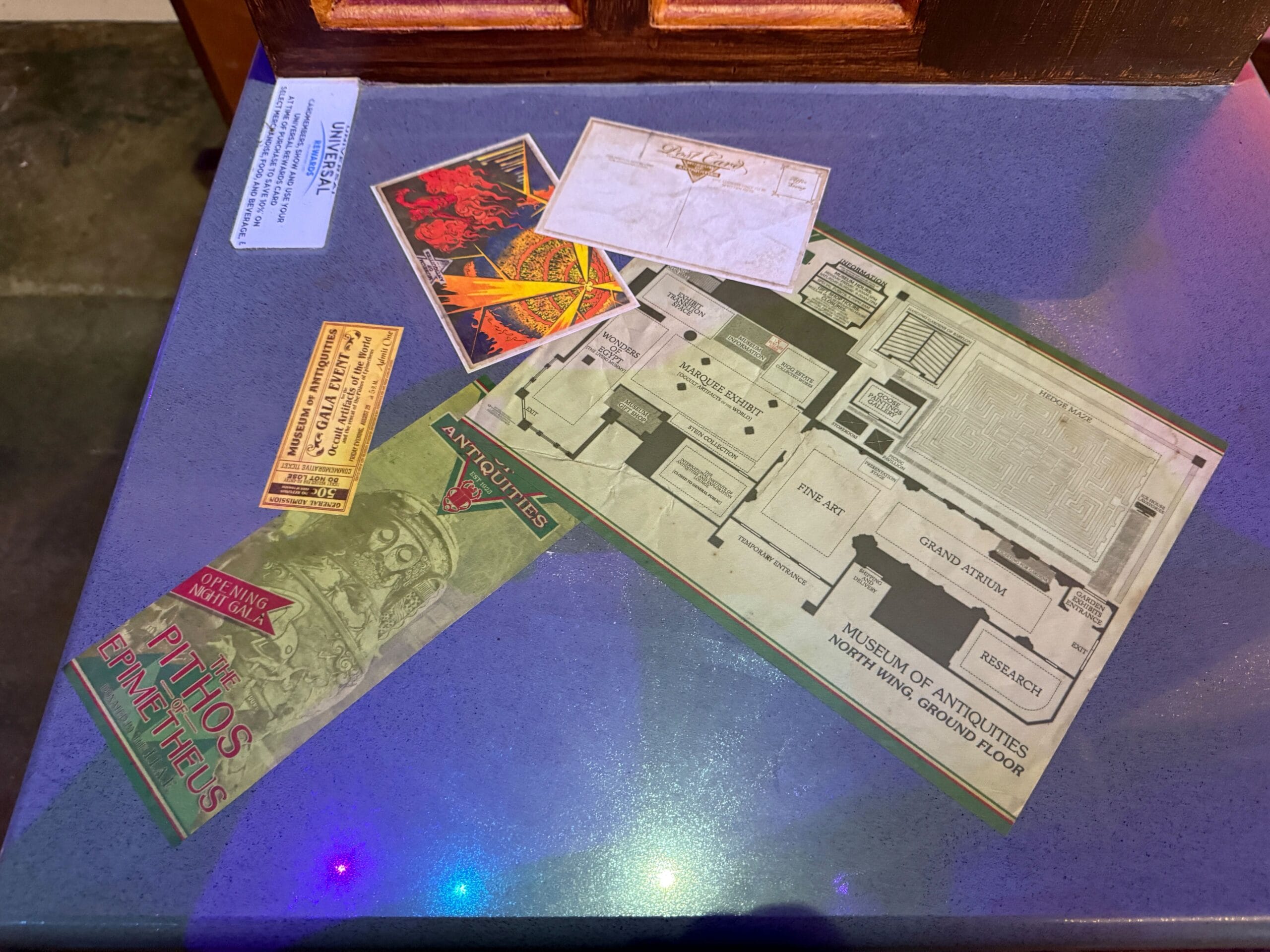 Two fresh posters near the Revenge of the Mummy exit ramp promote the museum’s attractions. One mentions they have teamed up with The International Institute of Antiquities & Explorations for a “Deciphering Legend of Myth” display. The other one talks about the Pithos of Epimetheus.
