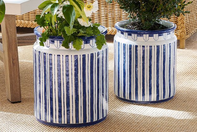 The The collection by Mark D. Sikes made its debutAt Pottery Barn in May, but certain styles are already discounted, such as this set of three outdoor cachepots. Featuring Sikes’ iconic blue from the line, the medium-sized, scalloped pot is 9.5 inches by 10.5 inches, making it suitable for a full fern or a young citrus tree.