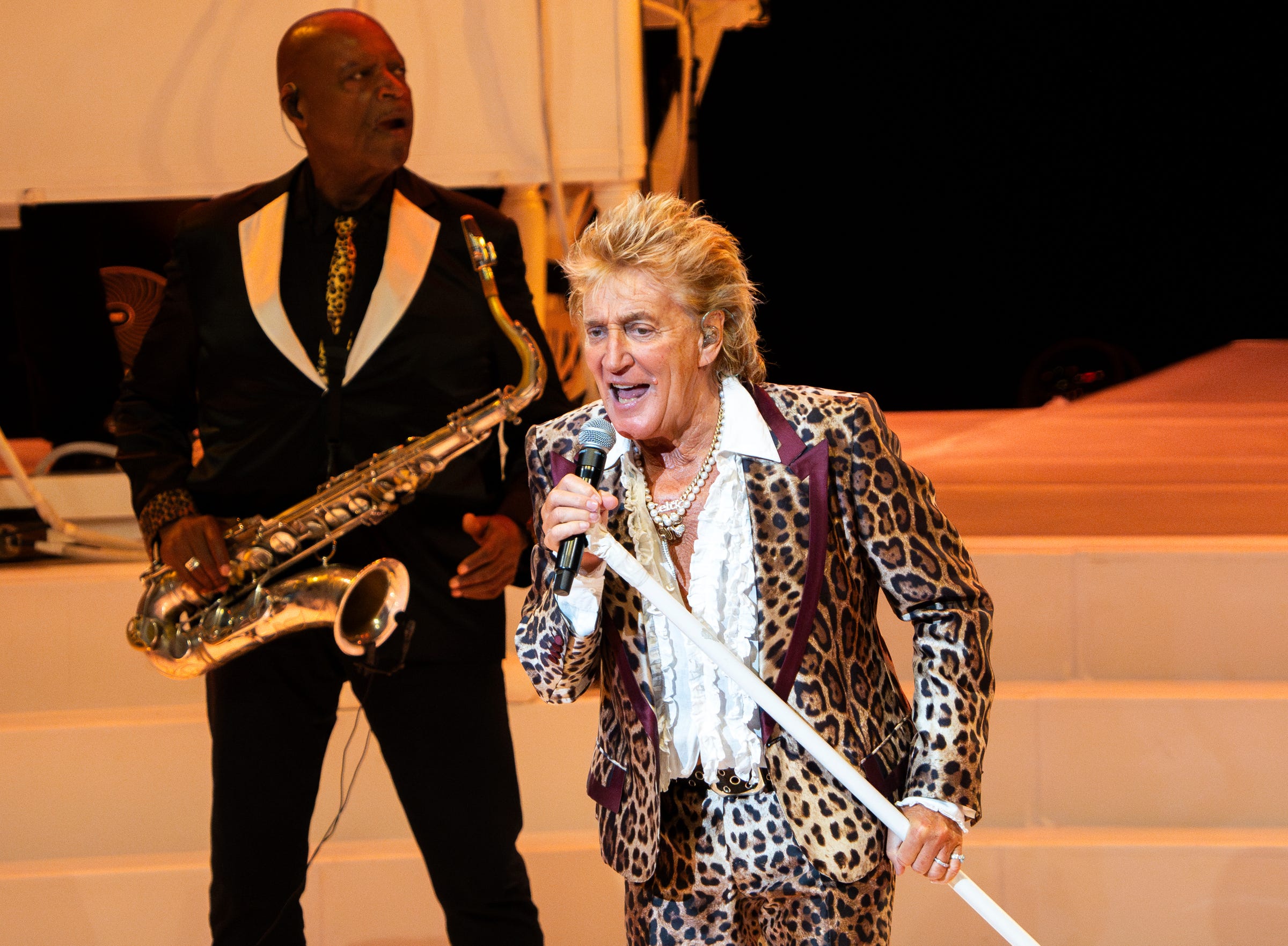 These days, Stewart’s concerts take their cues from his long-running Las Vegas residencies, and there was a snazzy polish to Tuesday’s proceedings. He took the stage in one of his classic leopard-print suits, the first in a series of outfits mirrored by the women in his supporting cast, including three backing singers, a pair of fiddlers and a percussionist-harpist.