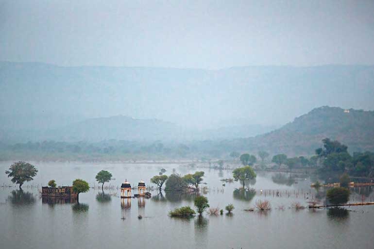 In the semi-arid region of Rajasthan, there is a unique happiness brought by the rains. On the following morning, as we began our journey, the entire landscape appeared to be joyful. In the fields, tall and proud bajra plants are surrounded by walls made of rough stone. Wild gourd vines spread uncontrollably over thorny fences. Buffaloes relax in muddy ponds. In the courtyard of a village house, a mother is washing her young son, scrubbing him thoroughly for school. Our jeep departs the valley and heads towards a road that winds into the surrounding hills. As it ascends through the forest, I find myself in a paradise for naturalists. The dhau trees have sprouted sage-silver new leaves, each one shaking with small droplets of water. Khair, ronjh, kullu, salai—each tree is covered in fresh greenery, spreading out to welcome the rain.