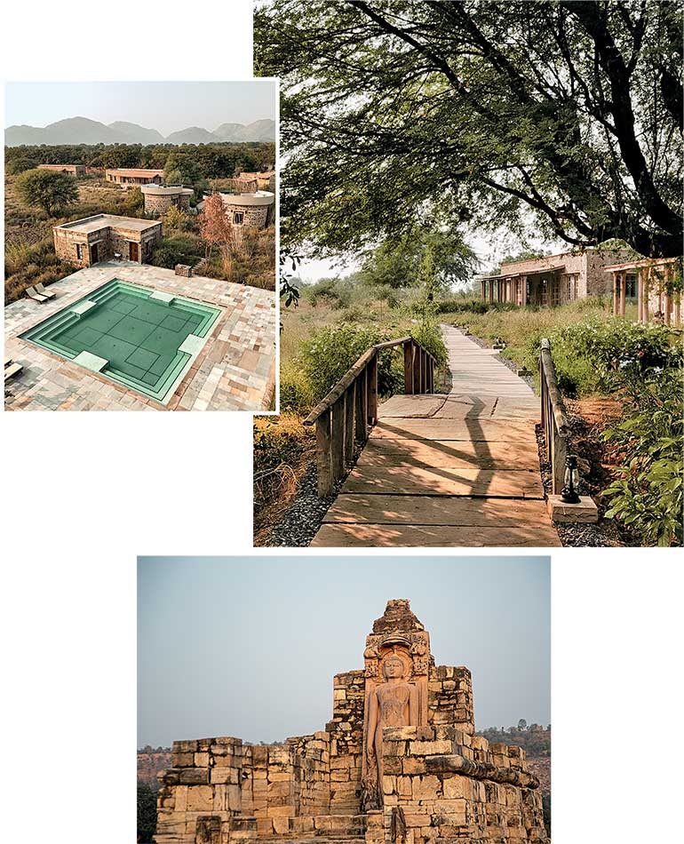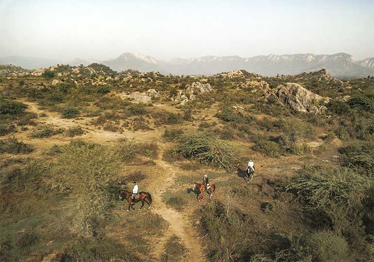 Anand and Rie Shekhawat established Sariska Lodge after many years of working with Aman Resorts, eventually opening their own establishment. Anand’s father was a forest officer, and he spent his childhood in various wild areas across Rajasthan. Living outside Sariska allowed him to combine his passion for the jungle with his career in hospitality. Eleven stone-built suites are spread throughout thick clusters of grasses, trees, and flowering bushes. Winding paths lead to the dining area, spa, pool, and stables. The rooms offer a cool escape from the humid monsoon weather, with their elegance balanced by playful tiger and leopard designs on the window coverings, lamps, cushions, and artwork.