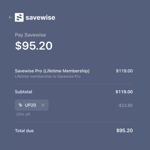 If you’re prepared to upgrade to a Savewise Pro account, you cansave an extra 20% by clicking this link and using the promo code promo code UP20.