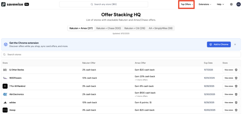 If you’d like to view all available combined deals, simply click on “Top Offers” and then “Stackable OffersTo view Rakuten + Amex, Rakuten + Chase, Rakuten + Cit, and AA + SimplyMiles.