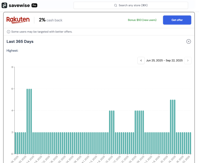 For instance, I checked the Banana Republic cash-back history via Rakuten. It appears that the current 2% cash-back deal is typical, although there are times when you can earn higher amounts. Users with free accounts have access to 14 days of history, whilePremium members have access to 365 days of historical data.