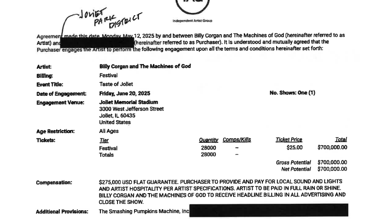 “$275,000 flat guarantee. The buyer must supply and cover the costs of local sound and lighting as well as artist hospitality according to the artist’s requirements. The artist will be paid in full regardless of weather conditions. Billy Corgan and The Machines of God will receive headline placement in all promotions and will close the performance,” stated the Joliet Park District contract.
