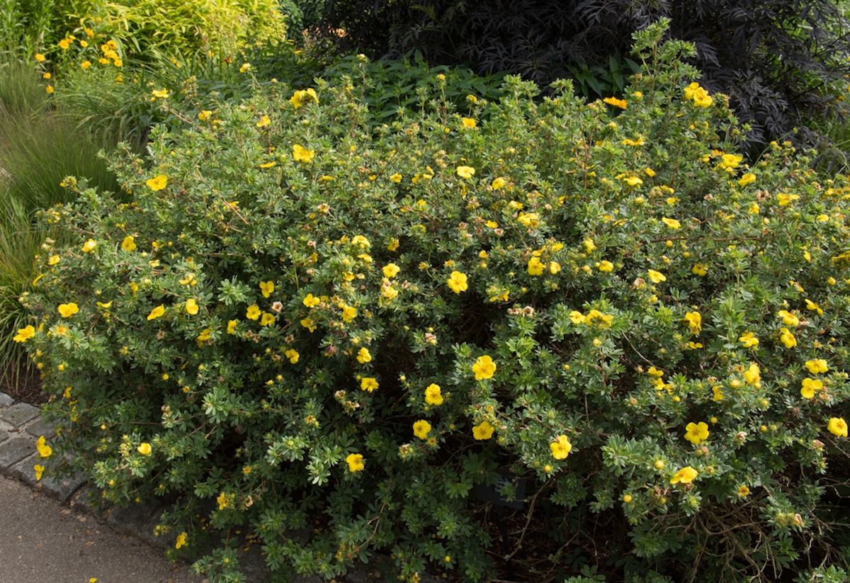 Also known as shrubby cinquefoil, this low-maintenance shrub was reclassified as Dasiphora in 2023, so look for plant care information and shrubs for sale under both names. A relative of roses, cinquefoil features 1-inch symmetrical flowers with five petals against delicate deep-green foliage. This North American native is even more striking in its hybrid forms, which can boast yellow, white, or coral flowers. Although it fares best in cool and mountain climates, potentilla remains one of the easiest shrubs to grow. It is considered a low-water plant and requires no pruning, or a light spring pruning into a rounded shape.