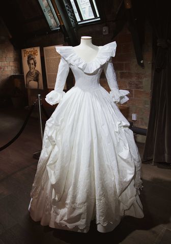 Di’s legendary wedding dress is a silk taffeta design that was colored in an ivory shade, rather than the usual bright white. It includes a lacey neckline, ruffled sleeves, puffed arms, a close-fitting top, a large ballgown skirt, subtle lace patterns, detailed stitching, 10,000 mother-of-pearl sequins, and, naturally, a remarkable 25-foot train. The main piece was a family effort, as it was created by Emanuel and her ex-husband, David Emanuel; Elizabeth Emanuel’s mother, Brahna Betty Weiner, also contributed to the embroidery.