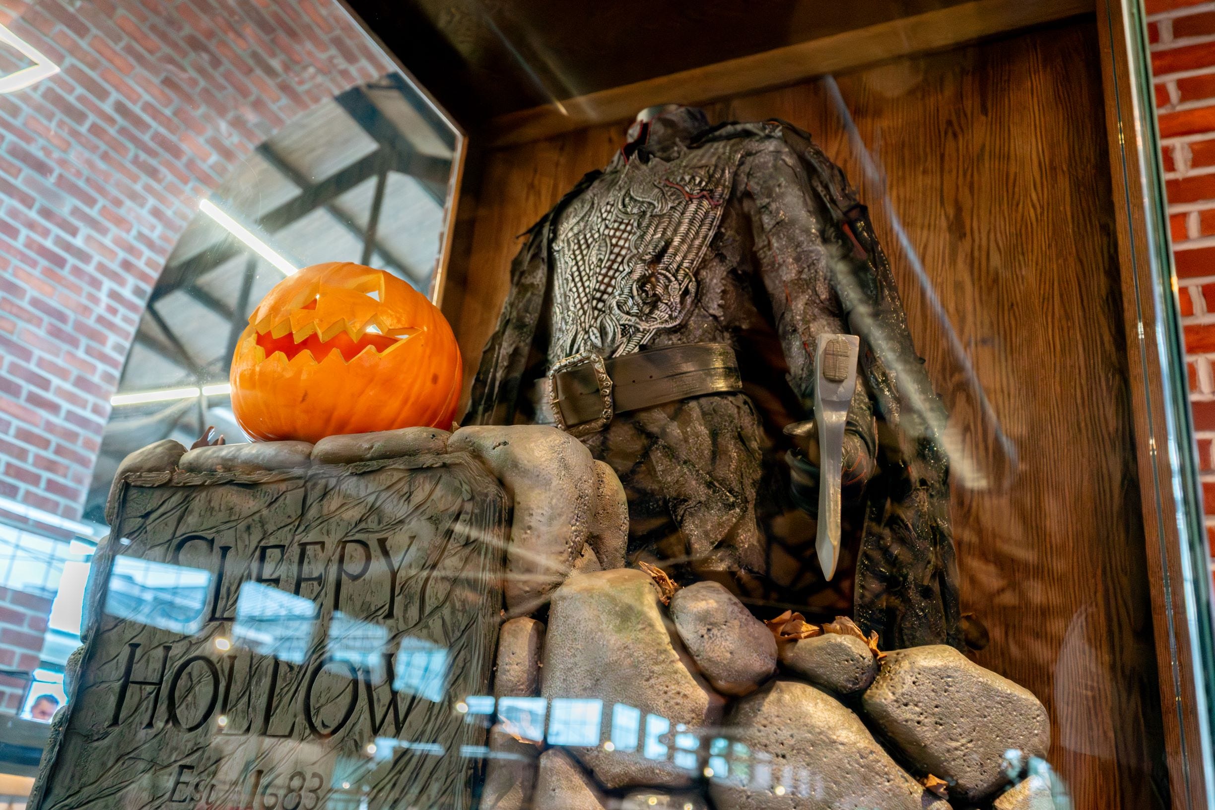 Believe me when I tell you that you’ve never encountered a grocery store like this. This large, warehouse-style area features two levels, offering aisles filled with fresh, canned, and ready-to-eat foods. However, the main attraction is the bar and outdoor terrace on the second floor, where The Hollows pub serves delicious smash burgers, pizzas, sandwiches, and more. Additionally, there’s a unique collection of memorabilia from the 1999 movie “Sleepy Hollow,” including the costumes worn by Christopher Walken and his stuntman Ray Park as the Headless Horseman. You can also view displays featuring the Lady Van Tassel dress worn by Miranda Richardson and a Hessian Soldier outfit. Furthermore, there’s a wall showcasing concept art from the Disney animated version of “Sleepy Hollow,” created by Mary Blair.