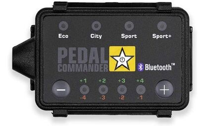 The device connects via the OBDII port and has a control box that can be mounted on the dashboard, under the dash, or in the glove box. It offers wireless control through a smartphone app. The Pedal Commander comes with 36 settings, including four modes—Eco, City, Sport, and Sport+—along with sensitivity adjustments for each mode.