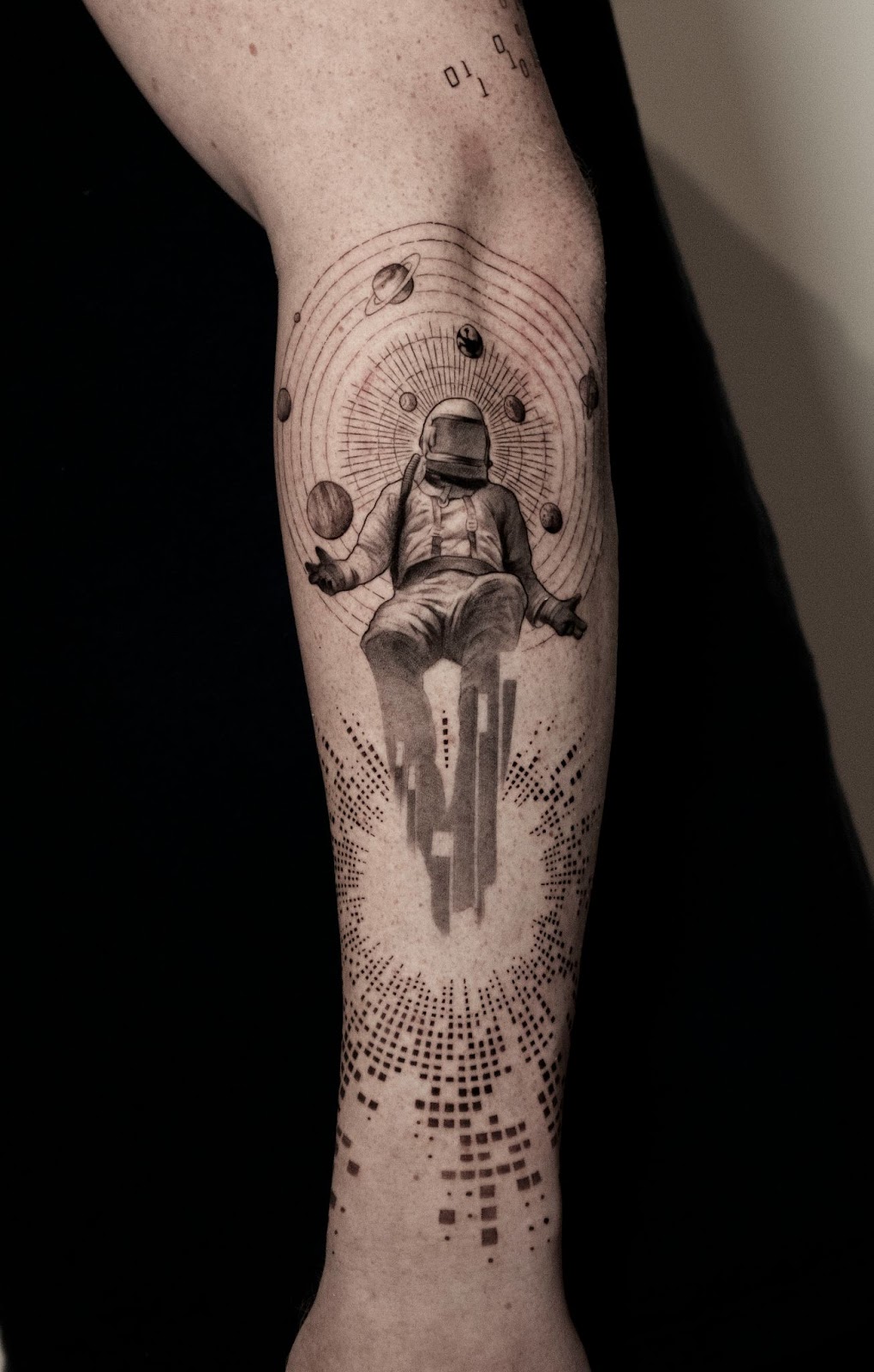 His artistic evolution was driven by a desire to enhance focal points without relying on heavy shading or dark backgrounds. “Instead of relying on unnecessary background fills, I’ve explored different ways to enhance the focal point — and through a lot of experimentation, I found that elements like geometric lines, binary code, mathematical formulas, and scientific diagrams not only make the main subject more striking, but also add a unique visual appeal,” Park elaborates. “I’m constantly refining my style to achieve both meaning and aesthetic impact — which I believe is the ultimate goal of a tattoo.”